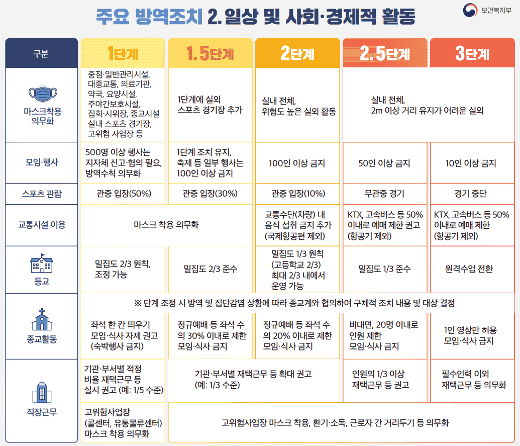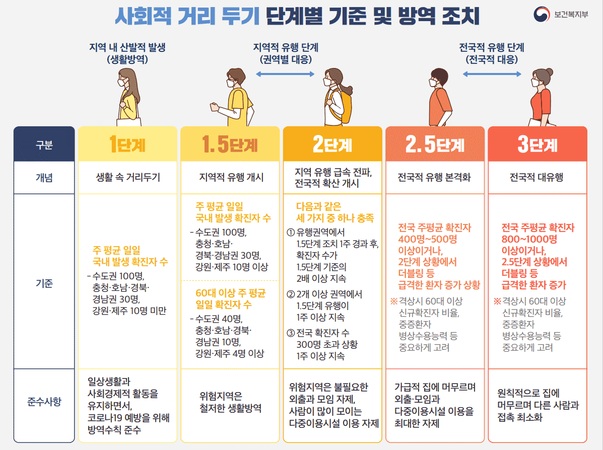 2단계 사회적 거리두기는 지역 유행 급속 전파 혹은 전국적 환산 개시 단계로 다음과 같은 세 가지 중 하나가 충족 시 발동됩니다. ▲유행권역에서 1.5단계 조치 1주 경과 후. 확진자 수가 1.5단계 기준의 2배 이상 지속 ▲2개 이상 권역에서 1.5단계 유행이 1주 이상 지속 ▲전국 확진자 수 300명 초과 상황 1주 이상 지속