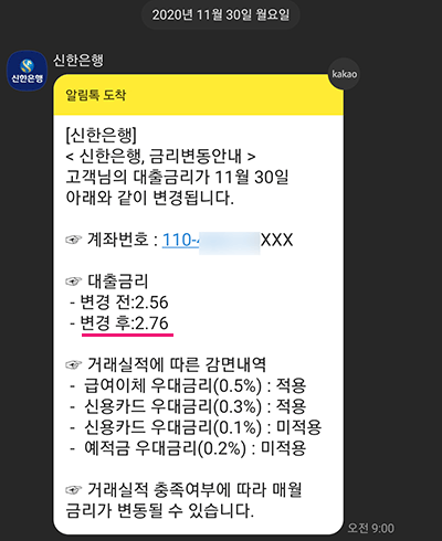 ③ 11월 30일 9시 카톡으로 금리가 2.76으로 변동됐다는 안내가 왔다