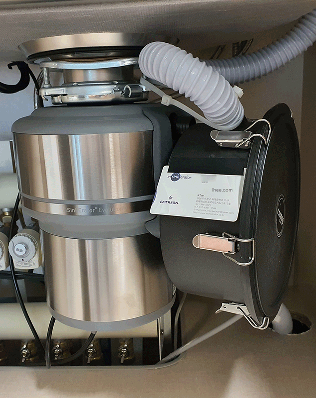 번쩍이는 인싱크이레이터 옆에 검정 통이 붙어 있습니다. 이건 2차 처리기라는 건데. 디스포저형 음식물 처리기는 2차 처리기가 꼭 설치되어야 합니다. 이것은 한국의 법 때문에 인싱크이레이터 본사에서는 없던 것을 한국업체가 따로 붙여 허가받은 것입니다. 이 2차 처리기에 설치 기사님 명함을 붙여 주셨네요.