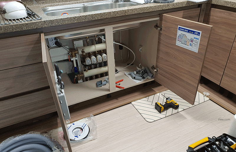 기사님이 이렇게 설치하기까지 30분이 채 걸리지 않으셨어요. 중간에 설치 기사님이 부품이 없다고 주차장 다녀오셨으니까. 설치 시간은 진짜 얼마 되지 않은 것 같습니다. 설치가 다 되면 인싱크이레이터 ISE-200과 2차 처리기가 싱크대 아래 공간이 차지하게 되어 싱크대 아래 공간이 좀 줄어듭니다. 그래서 싱크대 아래 솥 같은 큰 것은 둘 자리가 줄어들어 아쉬웠고 원래 온수 배관등 지저 분 것을 가리는 용도로 중간 나무판이 하나 있었는데, 그것도 설치할 수 없게 되었습니다.