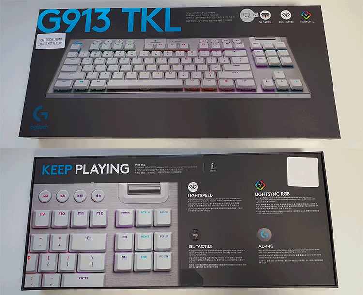로지텍 G913 TKL 박스입니다. 고급 제품이라 그런지 스마트폰 같은 패키지입니다. 덕분에 비싼 돈 준 느낌이 나네요. 박스 뒤에는 g913의 주요 특징을 정리해놨는데 총 4가지로 LIGHSPEED 무선의 1ms 반응속도와 최대 40시간의 배터리 사용시간, 1680만 RGB, GL TACTILE 스위치, 5052 알루미늄 합금 탑 케이스입니다.