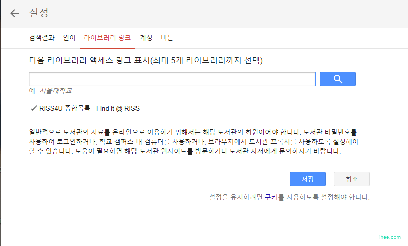 검색된 학술 자료는 초록은 대부분 볼 수 있지만 전체는 다 볼 수 없는 경우가 있습니다. 이럴 경우 구글 스칼라는 이용하는 지역, 학교의 도서관에서 그 자료를 연결하여 볼 수가 있는 기능이 있습니다. 설정에 있는 라이브러리 링크를 설정하면 되는데 최대 5개까지 액세스 링크를 등록할 수 있으며 만약 "FindIt@Harvard"와 같은 링크가 표시되지 않거나 새로 등록하는 경우 본인의 도서관에 문의하셔서 액세스 링크를 확인하여야 합니다.